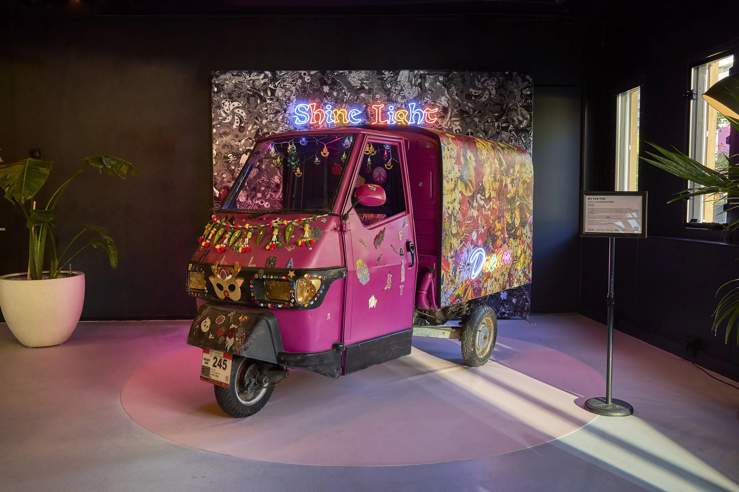Renowned British artist Chila Burman brought her bold, vibrant aesthetic to the Royal Docks with My Tuk Tuk, a full-size decorated tuk-tuk featuring her signature motifs, Hindu deities, glitter, bindis, and tiger imagery. The installation celebrates heritage, identity, and joy, inviting visitors to engage with her playful, colourful exploration of culture and community.