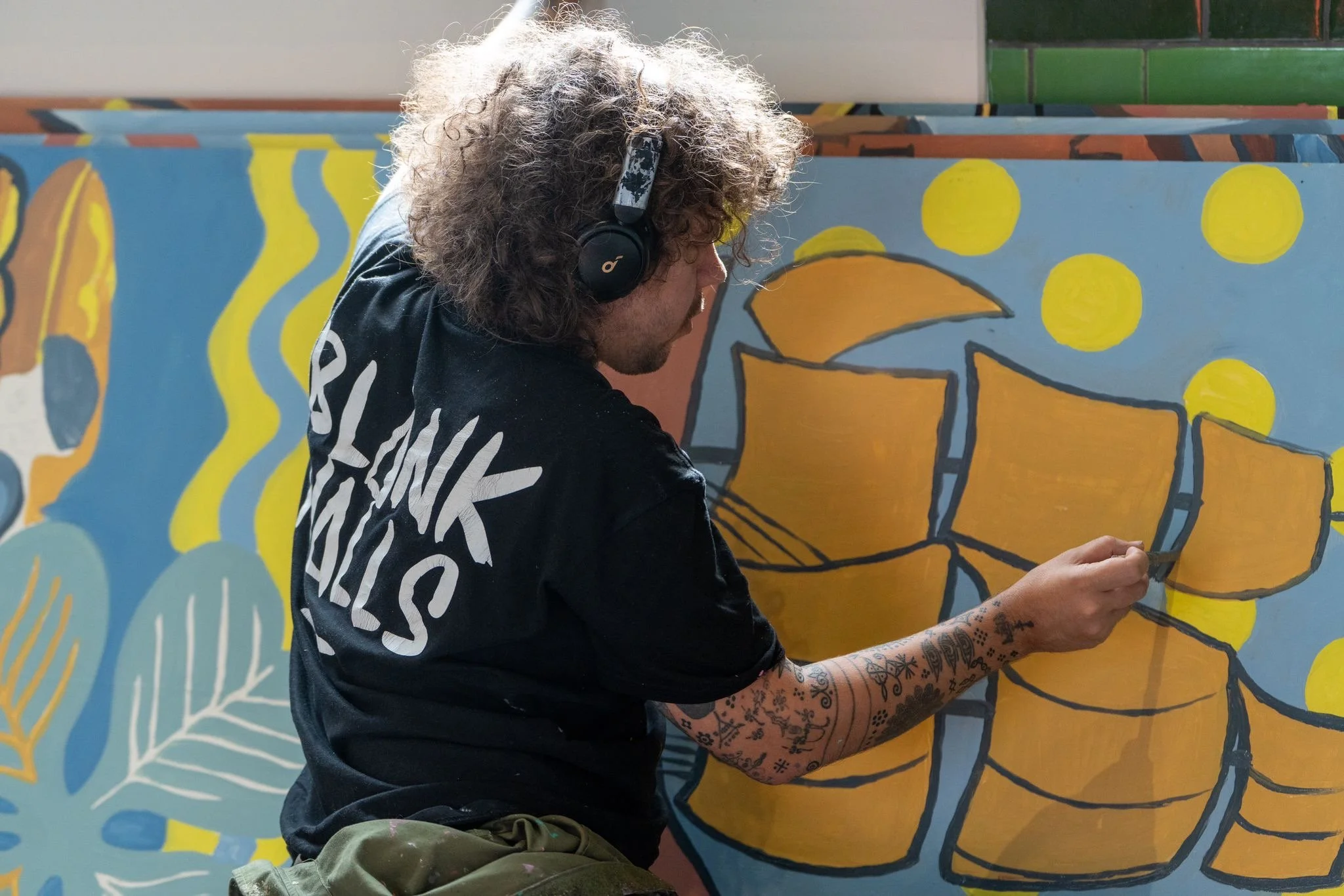 Creative duo Graphic Rewilding, Lee Baker and Catherine Borowski, transformed The Pump House façade with Blue Sunset, a vibrant mural celebrating Newham’s cultural diversity through flora and fauna. Developed with local residents, the artwork blends community stories, Docklands heritage, and urban nature, reflecting transformation, wellbeing, and the power of art to reimagine city spaces.