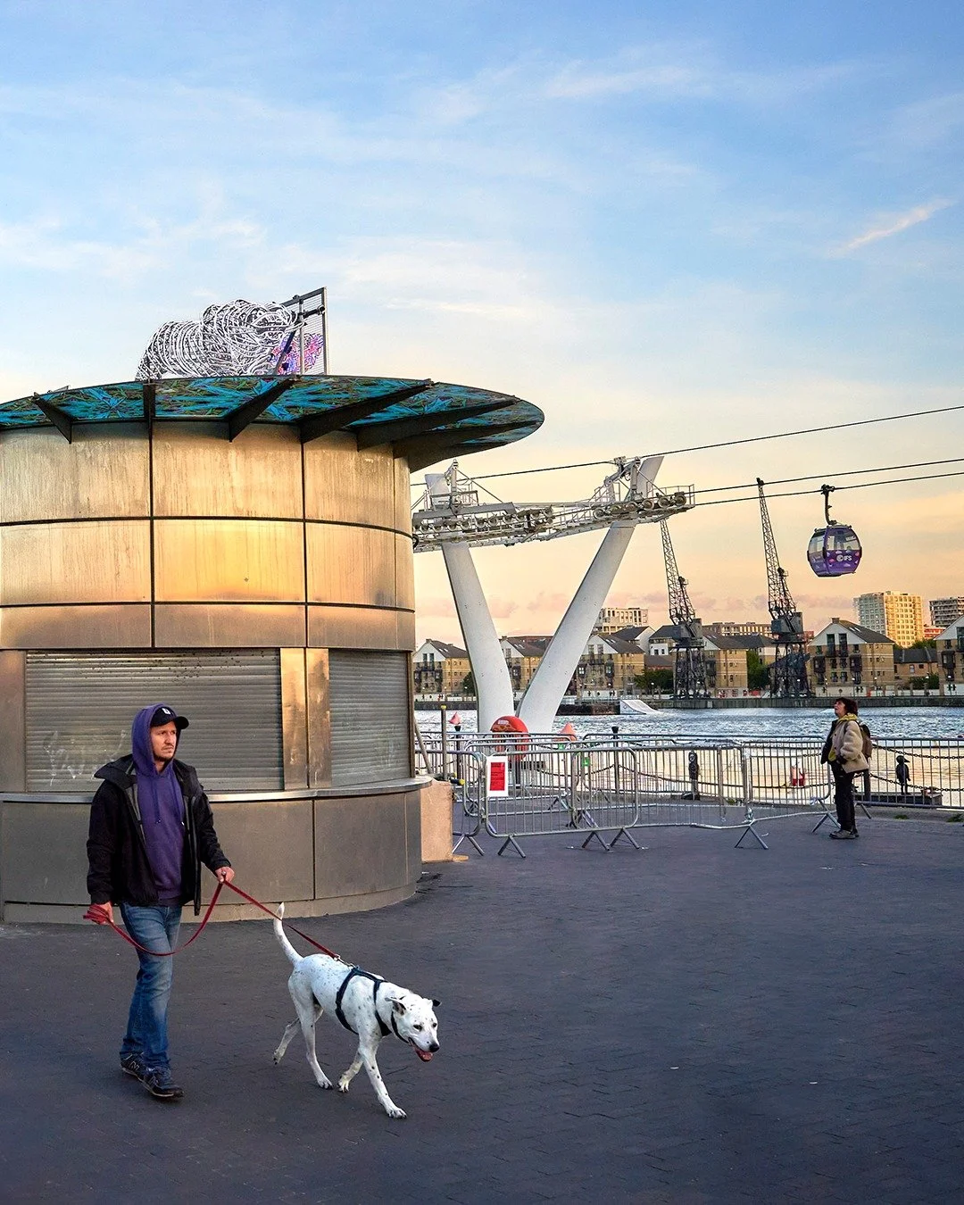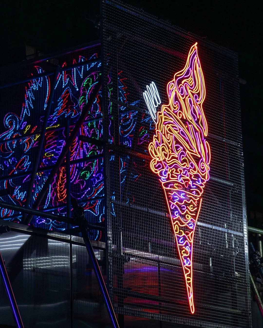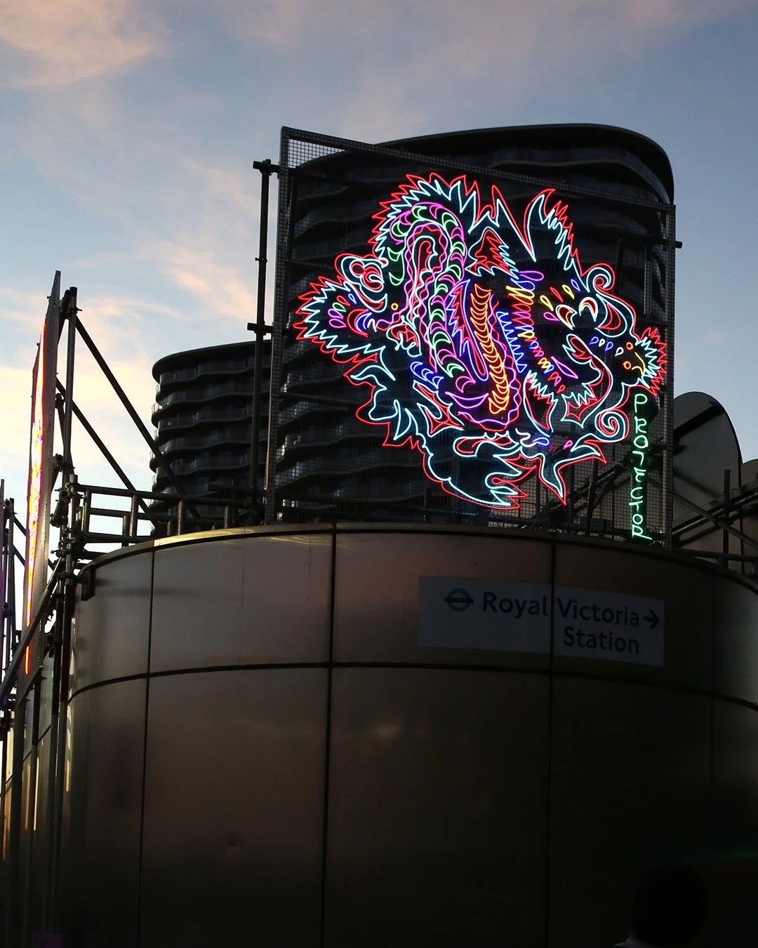 Three vibrant neon sculptures: an ice cream, mermaid and dragon light up the side and back of the kiosk. Burman interweaves her personal history with that of the Royal Docks; reflecting on memories of her father’s ice cream van, she also references the sugar and ice cream factories that once existed at the Docks. Whilst Burman’s Mermaid is a testament to the strength of female energy, the Dragon is symbolic of water, power, wisdom and to Burman, a sense of fierce protection.